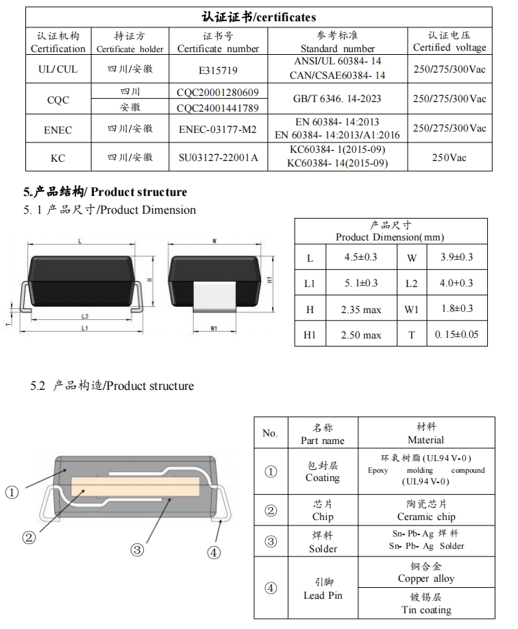 SL:+350~- 1000(ppm/℃) Y5P: ± 10% Y5U: +22%~-56% Y5V: +22%~-82%